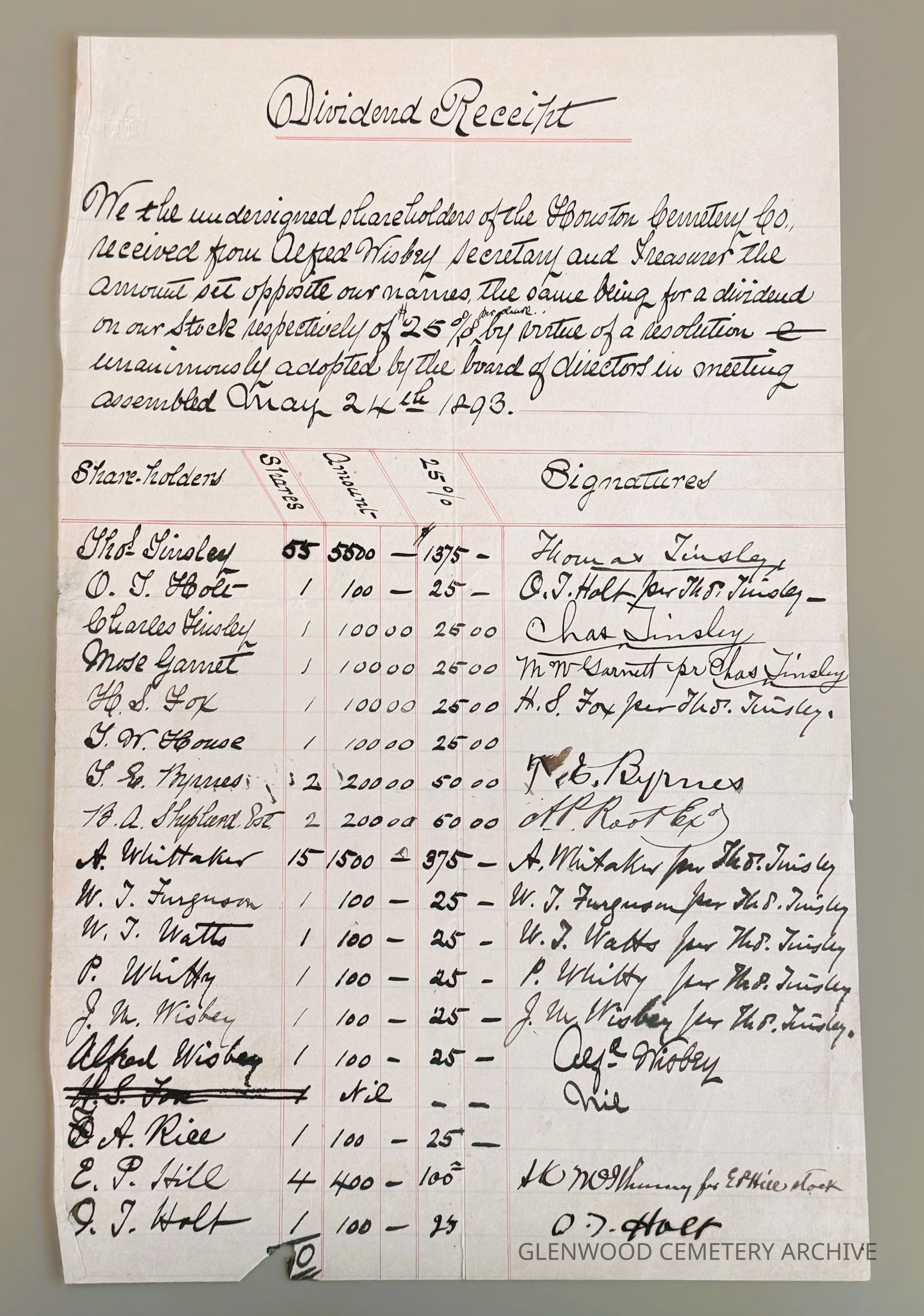 1893 Dividend Receipts from the Meeting of the Board of Directors of the Houston Cemetery Company