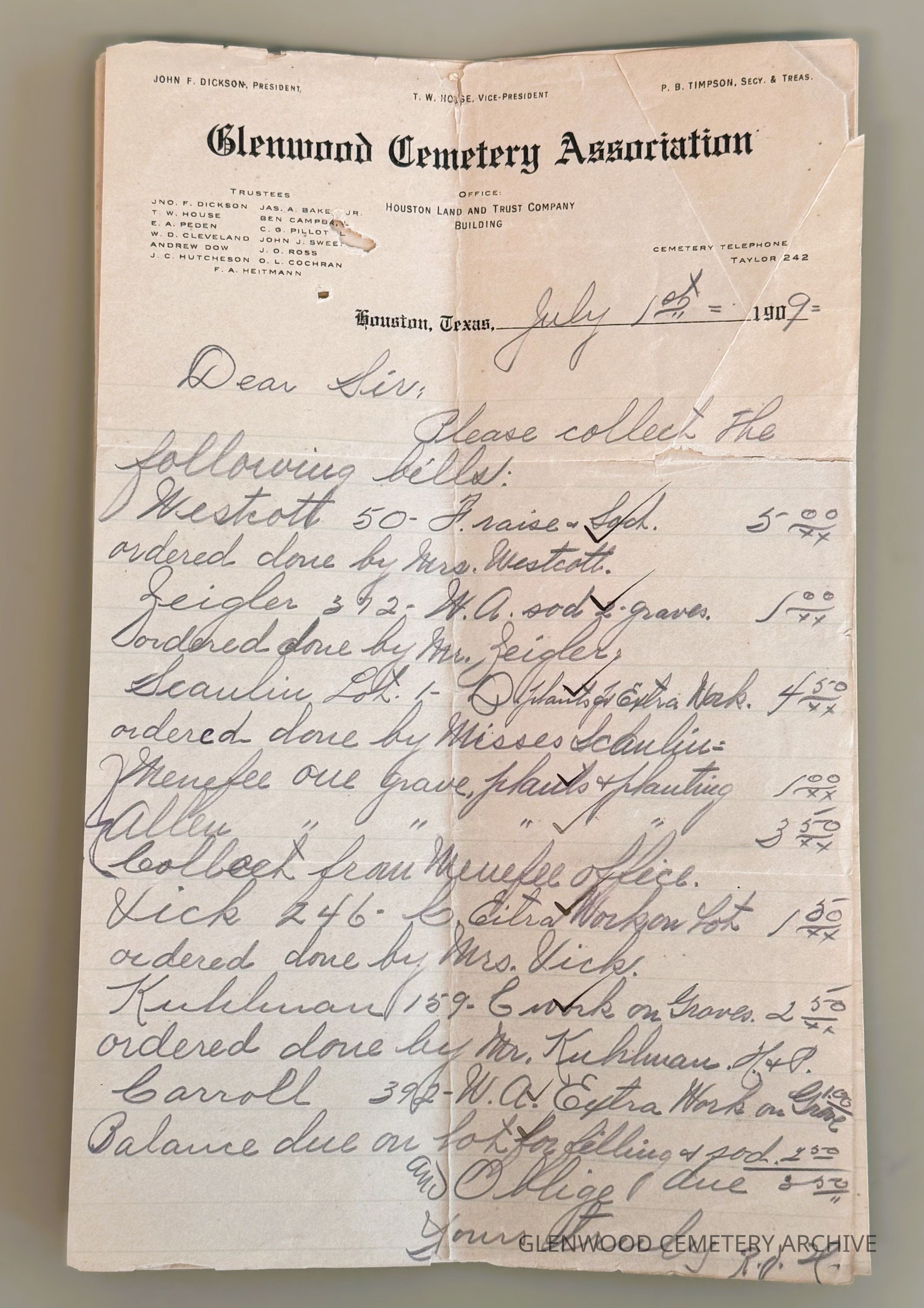 Reflective of Glenwood Cemetery’s long history of serving the public are voluminous archival records and original source holdings that document its residents and operations for over 150 years. These records contain the day-to-day business of the Cemetery and serve to memorialize the people interred there, revealing a vast store of genealogical and historical information.