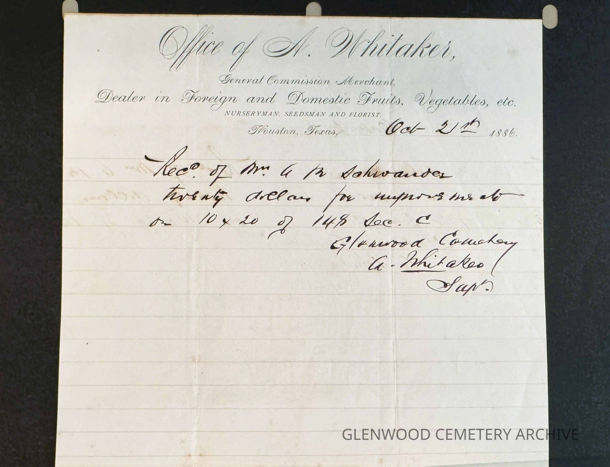 The document features a receipt from Alfred J. Whitaker's office, dated October 21, 1886. The receipt reads: Office of A. Whitaker General Commission Merchant Dealer in Foreign and Domestic Fruits, Vegetables, etc. Nurseryman, Seedsman and Florist. Houston, Texas, October 21, 1886 Rec’d of Mrs. A. M. Schwander, twenty dollars for improvements on 10 x 20 of 148 Sec. C. Glenwood Cemetery A. Whitaker Supt.